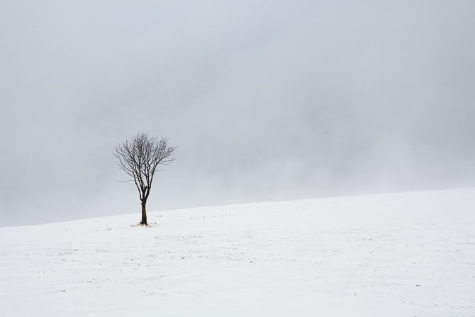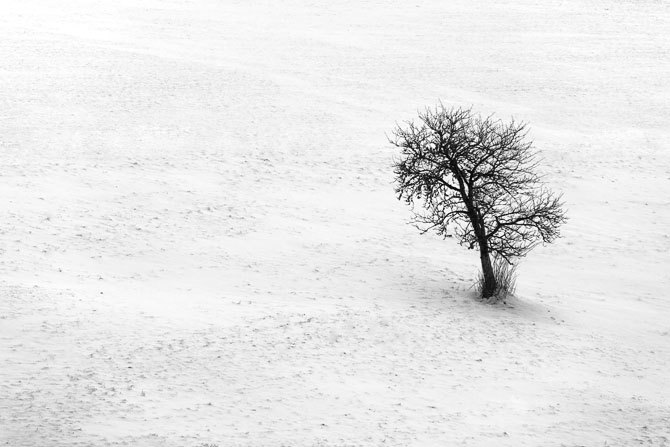 Arbre seul dans paysage enneigé